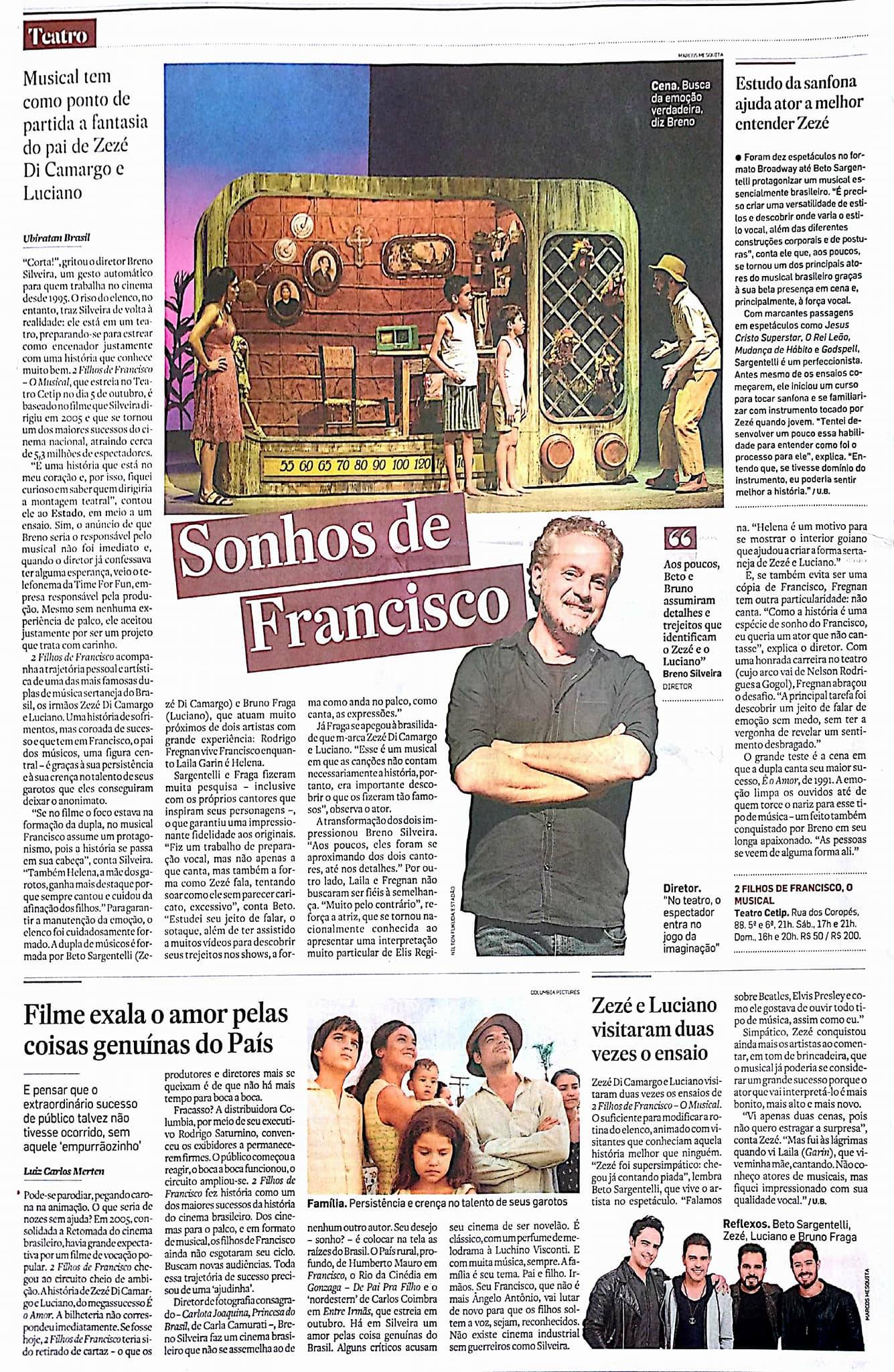 O Estado de São Paulo – Caderno 2 – Sonhos de Francisco – Matéria de Ubiratan Brasil, publicada dia 28/09/2017