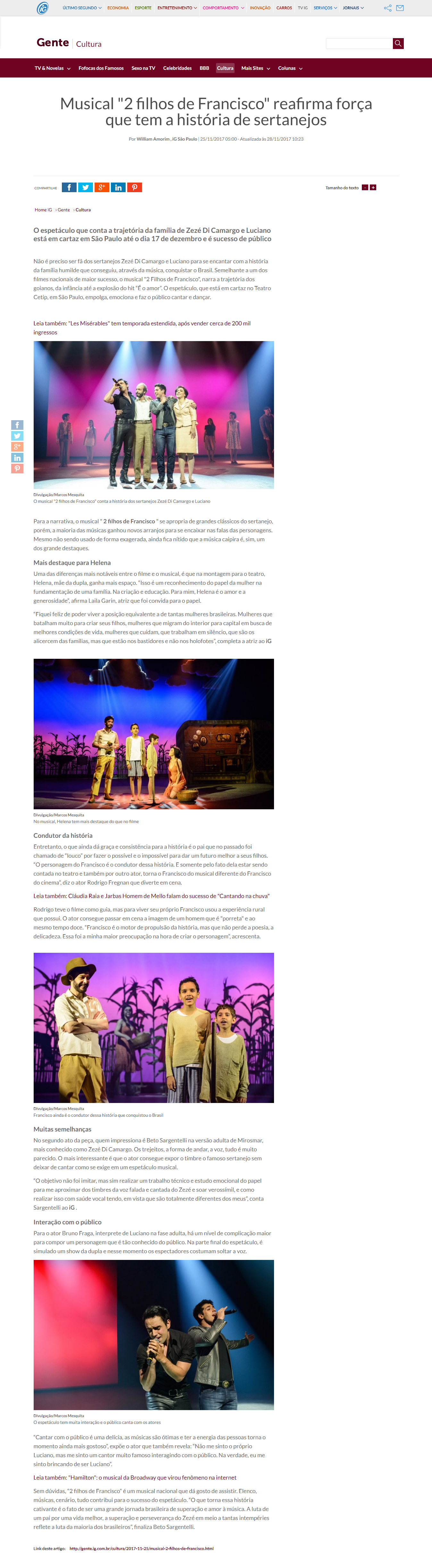 IG Gente – Musical “2 filhos de Francisco” reafirma força que tem a história de sertanejos – Matéria de William Amorim, publicada dia 25/11/2017