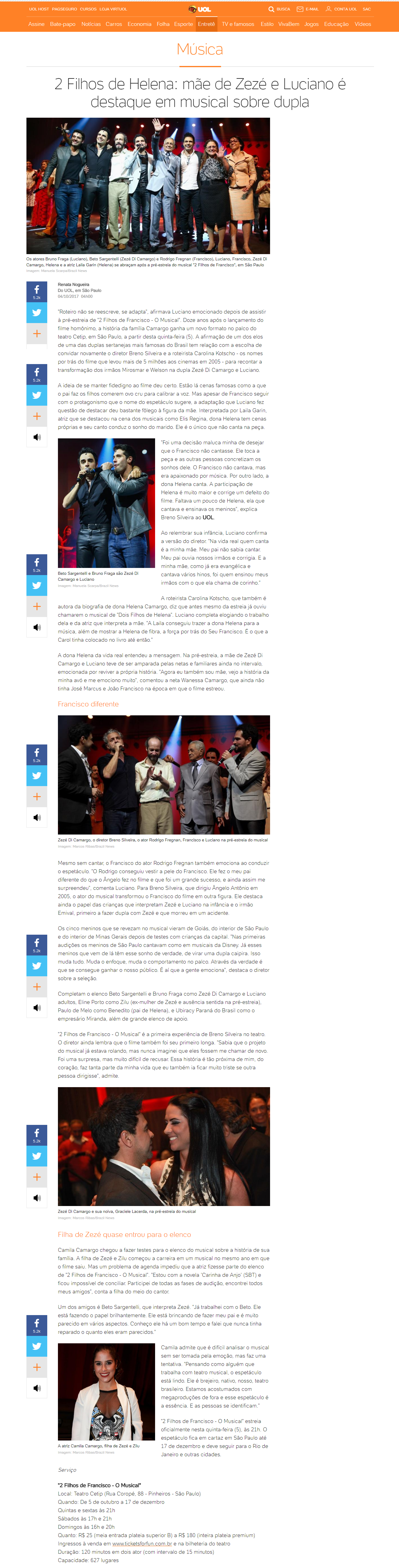 UOL – 2 Filhos de Helena: mãe de Zezé e Luciano é destaque em musical sobre dupla – Matéria de Renata Nogueira, publicada dia 04/10/2017
