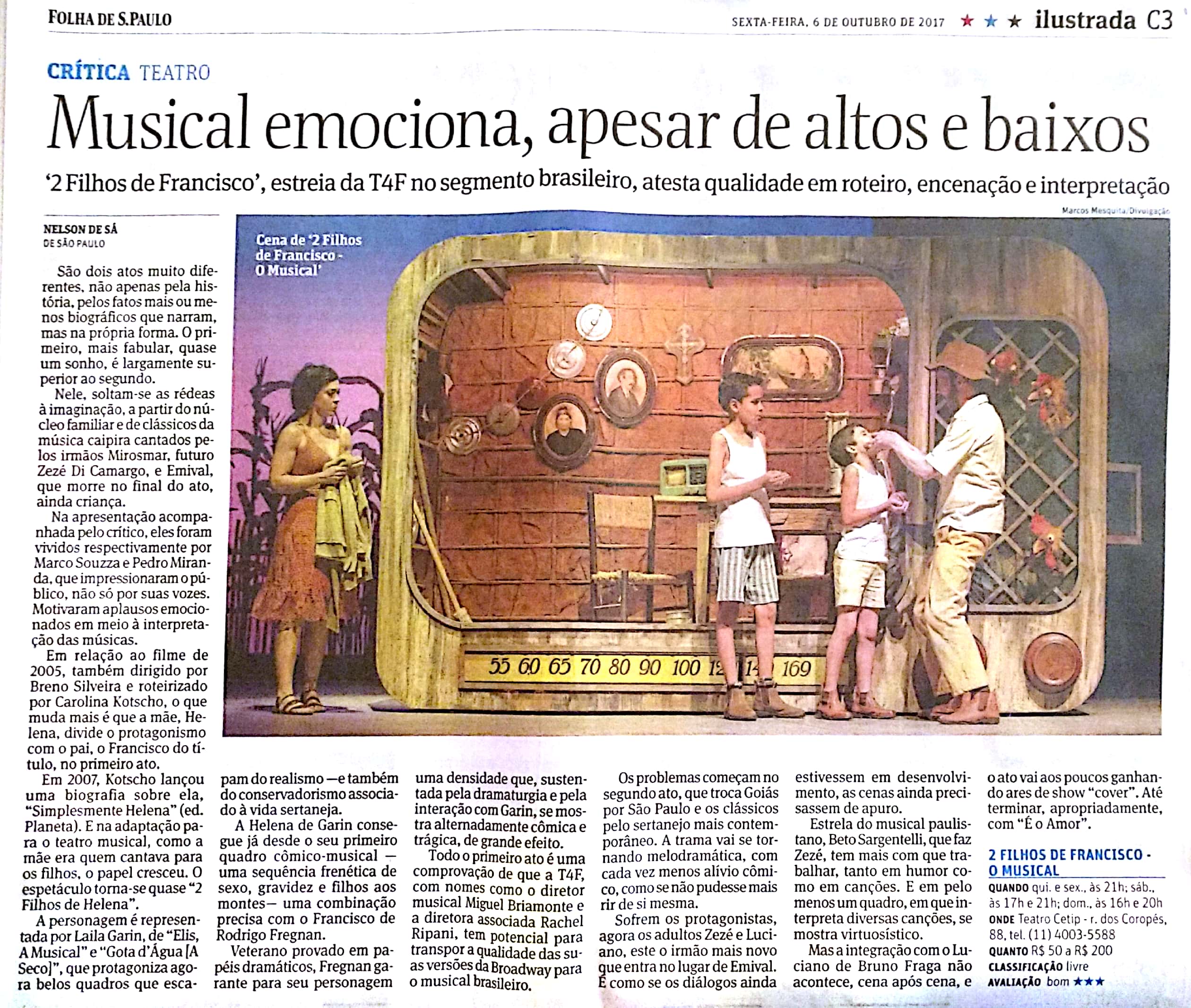Folha Ilustrada – Musical emociona, apesar de altos e baixos – Crítica de Nelson de Sá, publicada dia 06/10/2017