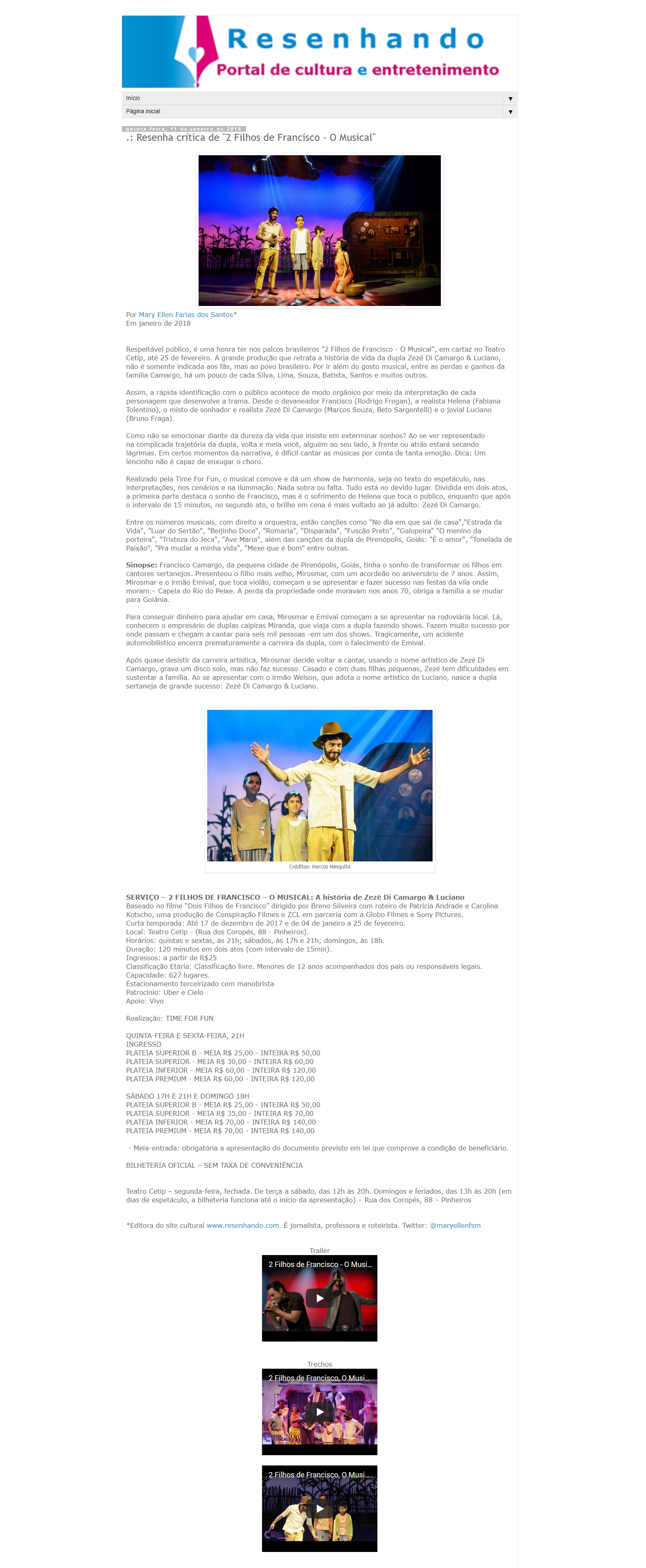 Resenhando – Resenha crítica de “2 Filhos de Francisco – O Musical” – Crítica de Mary Ellen Farias dos Santos, publicada dia 12/01/2018
