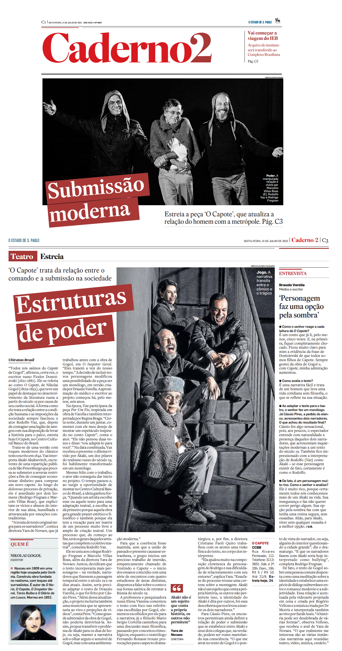 O Estado de São Paulo – Caderno 2 – Estreia a peça ‘O Capote’, que atualiza a relação do homem com a metrópole – Matéria de Ubiratan Brasil, publicada dia 24/07/2015