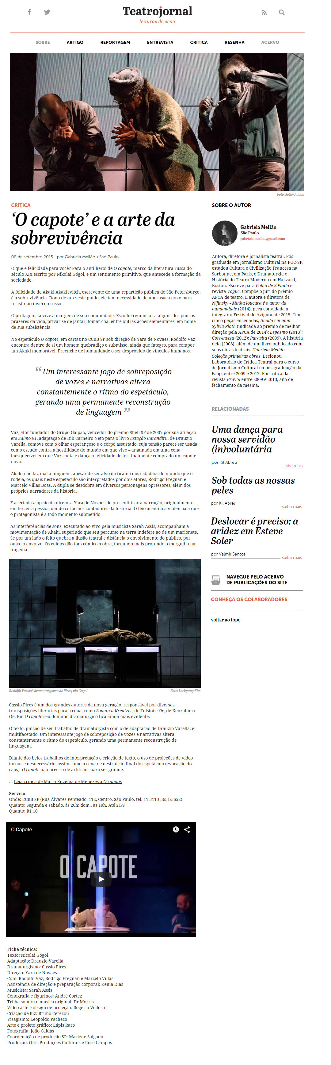 Teatro Jornal – “O Capote” e a arte da sobrevivência – Crítica de Gabriela Mellão, publicada dia 08/09/2015