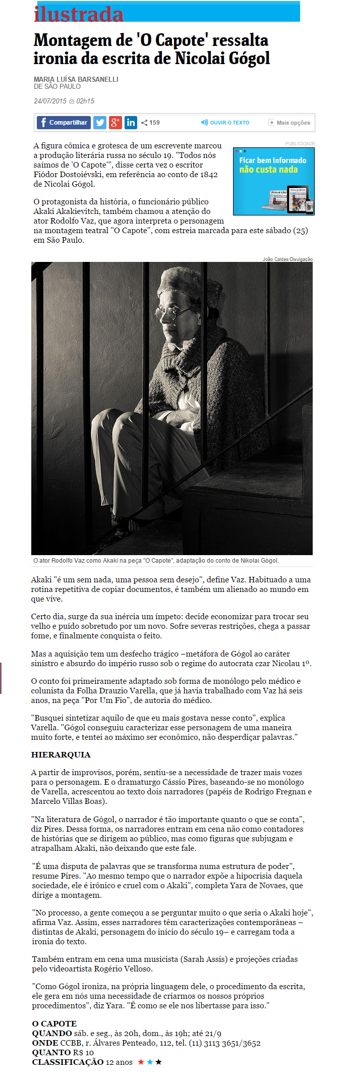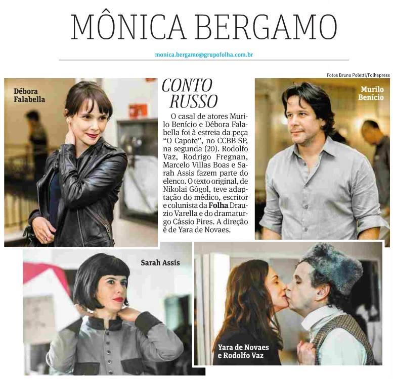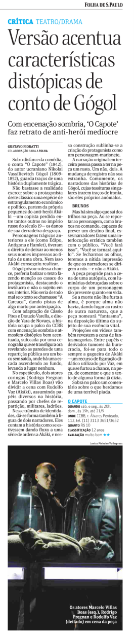 Folha Ilustrada – Montagem de ‘O Capote’ ressalta ironia da escrita de Nicolai Gógol – Matéria de Mônica Bergamo, publicada dia 24/07/2015