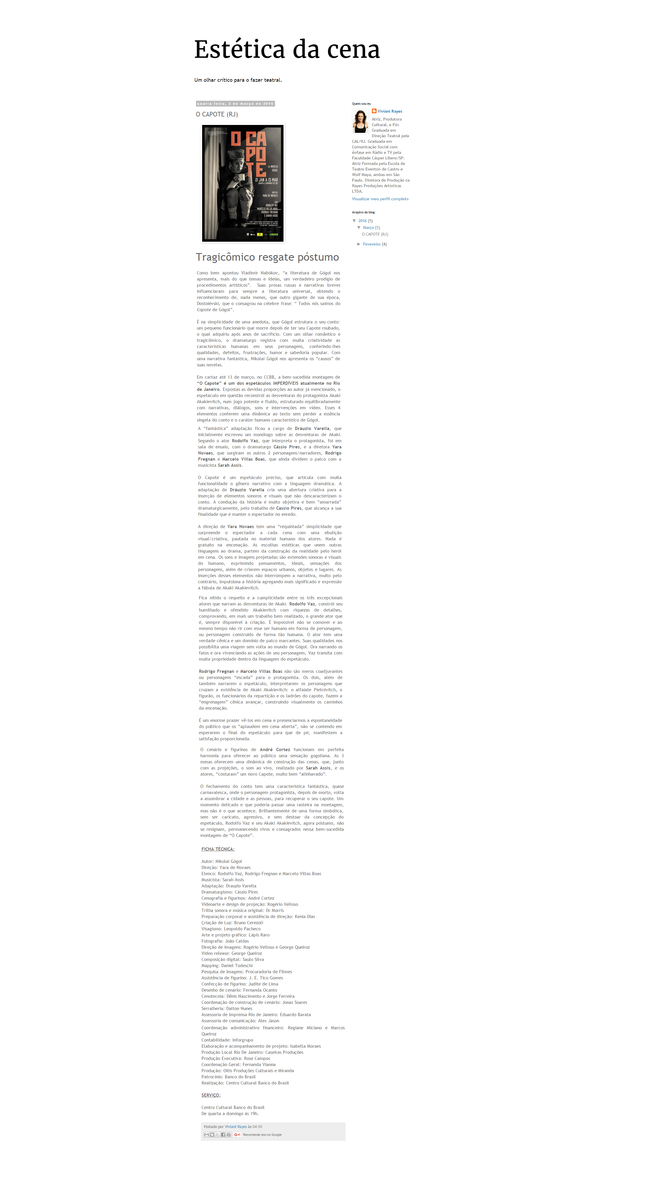 Estética da Cena – O Capote (RJ) – Crítica de Viviani Rayes, publicada dia 02/03/2016