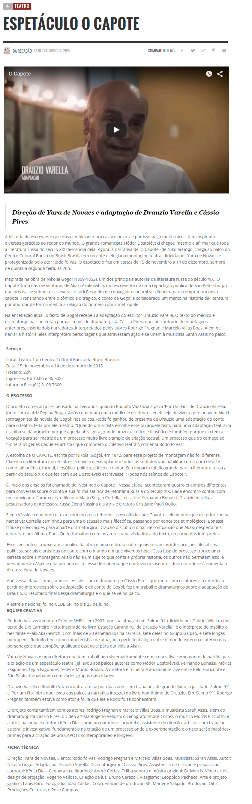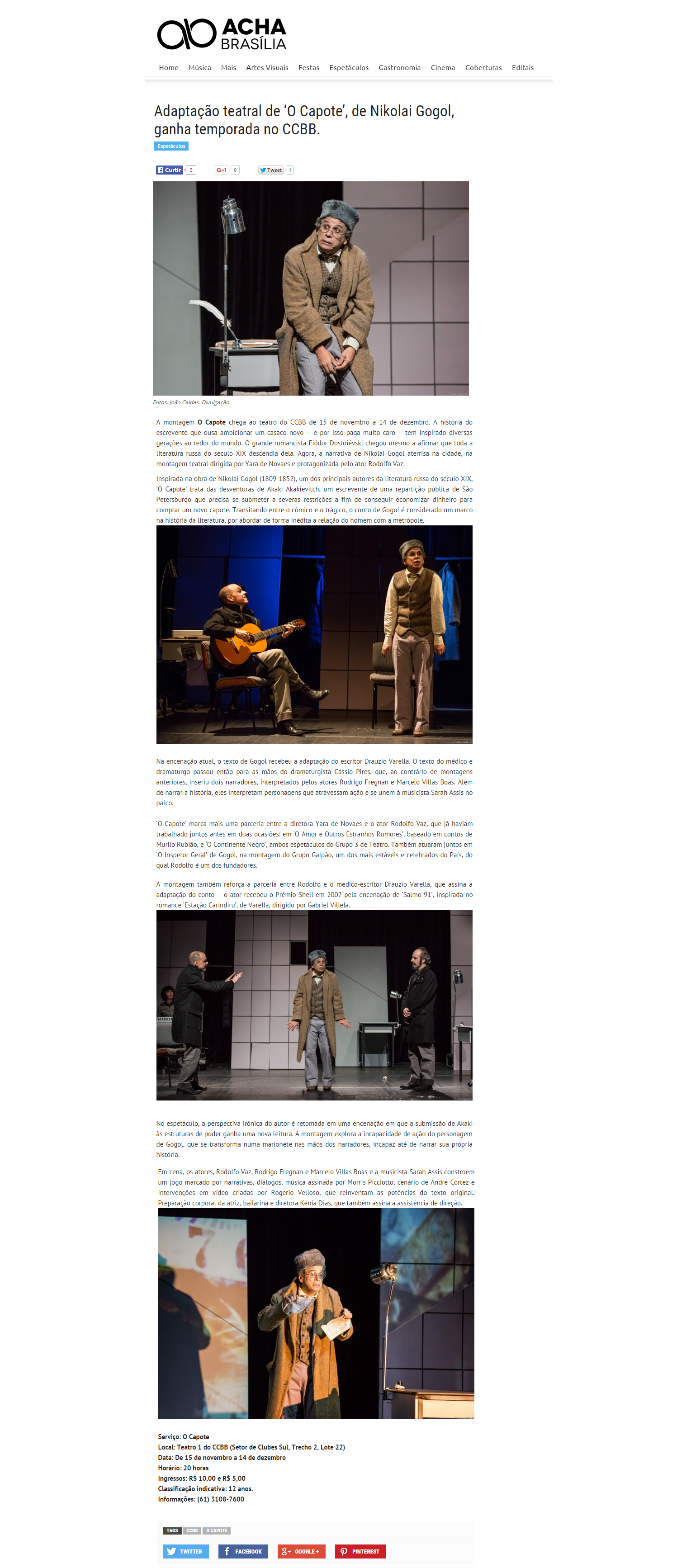 Aqui tem diversão – Espetáculo O Capote – Matéria da redação, publicada dia 17/10/2015
