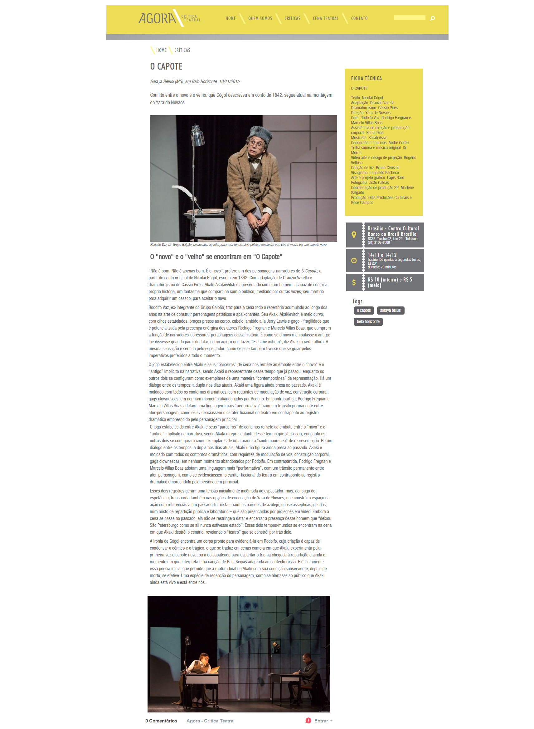 Adaptação teatral de ‘O Capote’, de Nikolai Gogol, ganha temporada no CCBB – Matéria da redação, publicada dia 10/11/2015