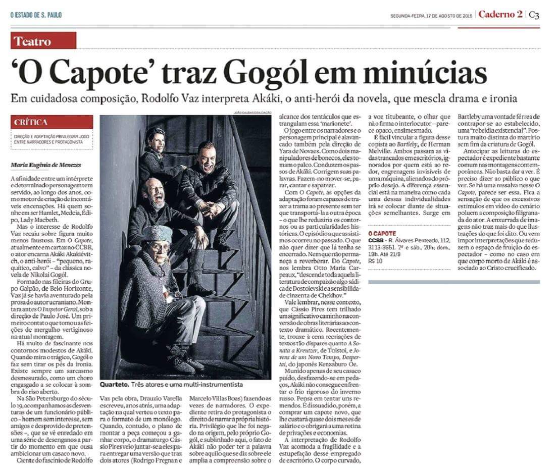 O Estado de São Paulo – “O Capote” traz Gogól em minúcias – Crítica de Maria Eugênia de Menezes, publicada dia 17/08/2015