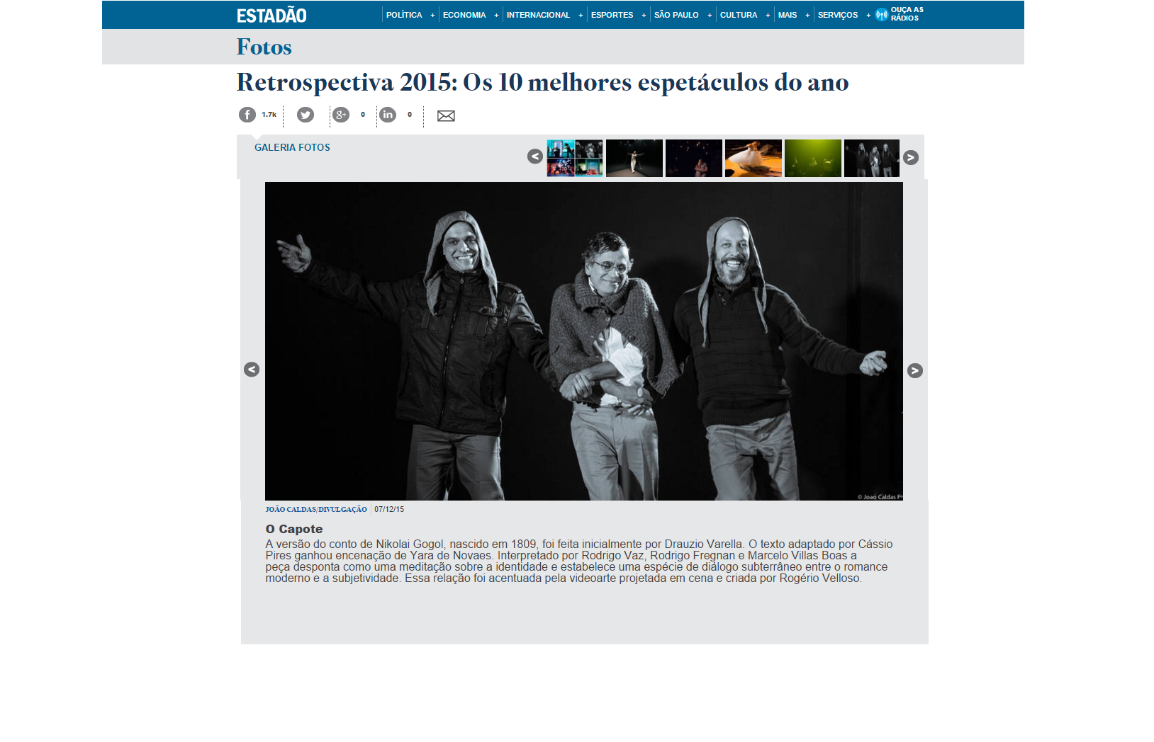 Retrospectiva 2015: Os 10 melhores espetáculos do ano – O Capote – Matéria do Estadão, publicada dia 08/12/2015