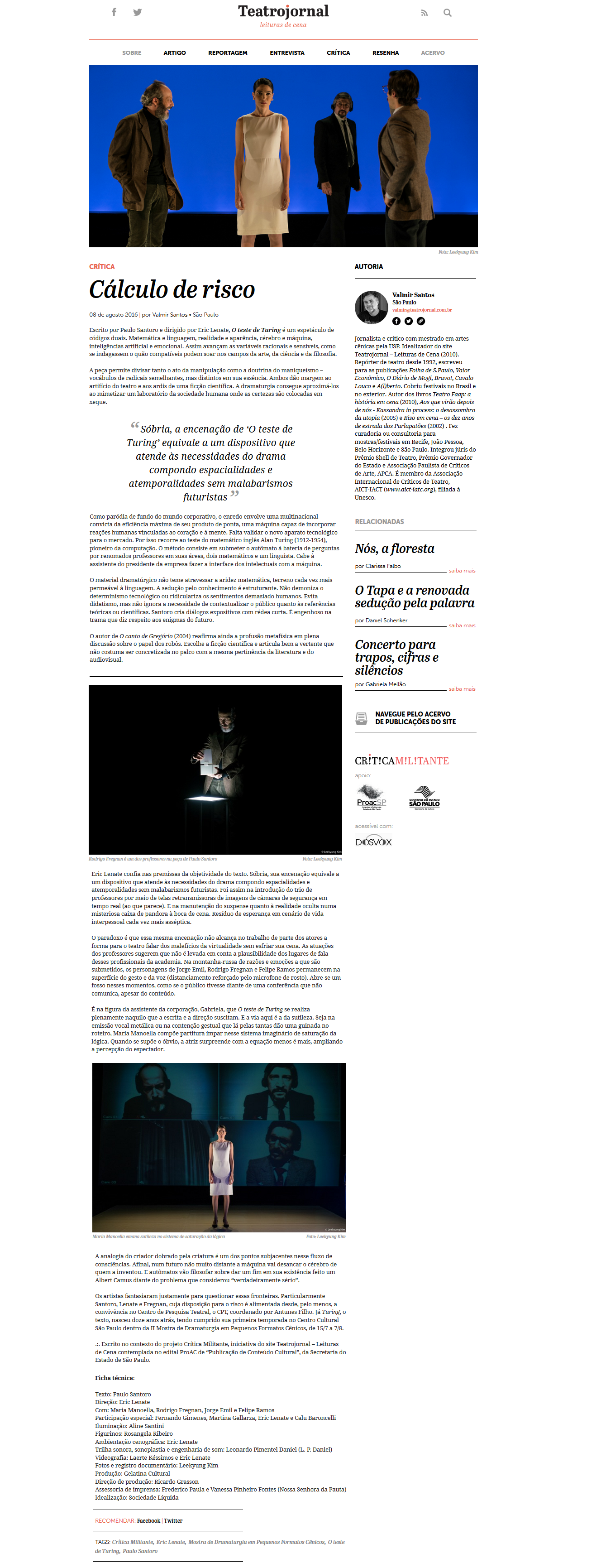 Teatro Jornal – Cálculo de Risco – Crítica de Valmir Santos, publicada dia 08/08/2016